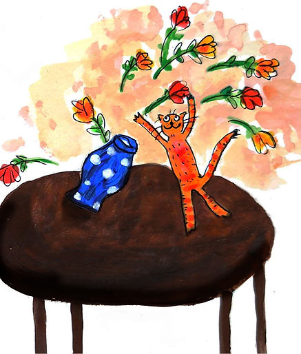 A hand-drawn children’s animation told through two GIFs: an orange cat pauses to smell a vase of tulips, then bursts into a joyful leap, sending petals flying.